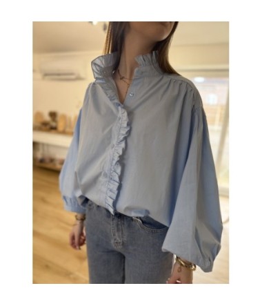 Prix 34,90 €Légère et aérienne, cette chemise bleu ciel réinvente le classique avec une touche de romantisme. Ses manches bouffantes et ses finitions volantées sur le col et la boutonnière en font la pièce idéale pour un look chic et féminin au quotidien.