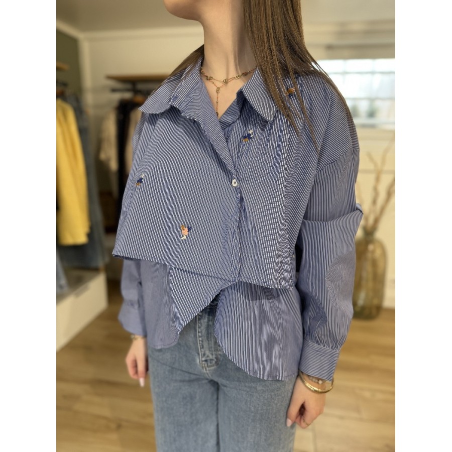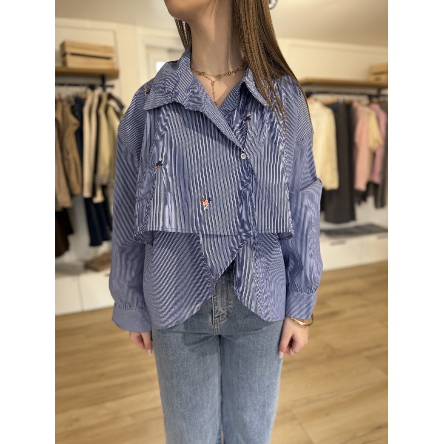 Affirmez votre style avec cette chemise déstructurée à rayures. Véritable pièce de créateur, elle se distingue par son empiècement asymétrique à l'avant et ses délicates petites fleurs brodées. Une pièce forte qui transforme instantanément un simple jean en un look pointu et moderne.